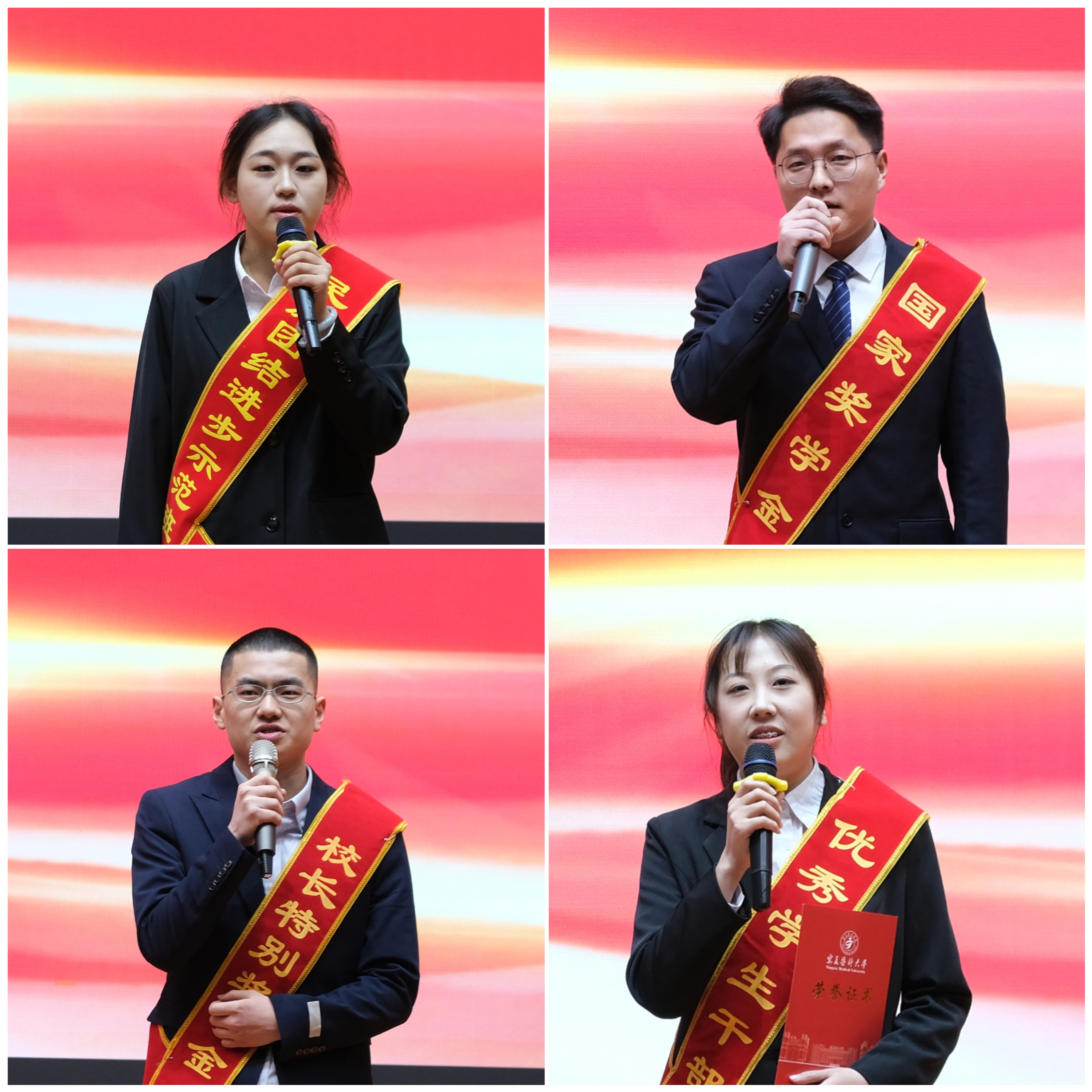 期间,受到表彰的学生代表公共卫生学院2023级预防医学2班张嘉麟同学、第一临床医学院2023级博士研究生单家豪同学、第一临床医学院2020级临床1班金海容同学和中医学院2021级中医2班武浩楠同学分别作了主题分享。