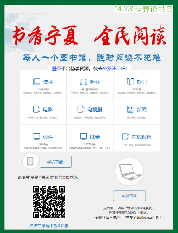 师生可在浏览器(推荐使用IE7.0以上版本)中输入网址http://sxnx.chineseall.cn直接登录,下载““书香宁夏·全民阅读”数字平台客户端,完成后解压运行“宁夏全民阅读.exe”即可。电脑下载支持WindowsXP、Windows7系统。