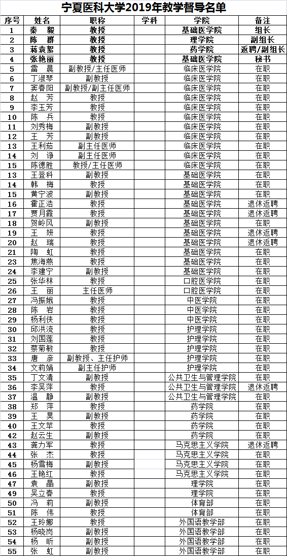 宁夏医科大学2019年教学督导组名单一览表
