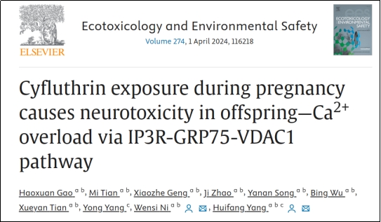 宁夏医科大学杨惠芳教授课题组在Ecotoxicology and Environmental Safety期刊(最新IF=6.2,中科院二区TOP)发表了题为Cyfluthrin exposure during pregnancy causes neurotoxicity in offspring—Ca2+ overload via IP3R-GRP75-VDAC1 pathway的研究论文,揭示了孕期氟氯氰菊酯暴露对子代的神经毒性,并发现该损伤与子代海马IP3R-GRP75-VDAC1通路异常激活诱导的神经元凋亡有关, 这一发现为了解孕期Cy暴露与后代的神经毒性机制提供了线索。